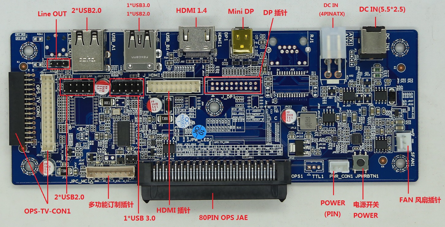 OPS子卡,也叫OPS轉(zhuǎn)接卡、OPS轉(zhuǎn)接板、OPS擴(kuò)展卡,按照 INTEL(Open Pluggable Specification)開(kāi)放式可插拔規(guī)范生產(chǎn),是將OPS電腦與一體機(jī)、電視機(jī)的內(nèi)部線路進(jìn)行連接的一個(gè)橋梁,可以將一體機(jī)或電視機(jī)內(nèi)部電源,通過(guò)OPS JAE接口提供給OPS電腦主機(jī),同時(shí)將OPS電腦的HDMI、DP、Audio、USB、COM、開(kāi)/關(guān)機(jī)等信號(hào)通過(guò)OPS JAE接口與觸控一體機(jī)的液晶屏驅(qū)動(dòng)板、喇叭、觸摸框、開(kāi)關(guān)等部件進(jìn)行對(duì)接,通過(guò)拔插即可實(shí)現(xiàn)觸控一體機(jī)、液晶電視機(jī)與OPS電腦主機(jī)之間連接使用!